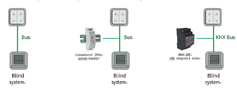 The KNX system can not only be very simple with few device but also be extended a complex system with hundreds device for use in a building. In both case, KNX power supply is needed for powering the KNX Bus. In this part, it explains why a KNX power supply is essential for KNX Bus environment and it cannot be replaced with conventional switching mode power supply. The first scenario is just a simple system with only two device (wall flush button and actuator for controlling electrical blind) on the KNX Bus shown in the Figure 2. In case the user press the button in order to turn on the electrical blind and see through the window, it turn out this system is not functioning. The digital command from button cannot be transmit to actuator for controlling the blind simply because the KNX Bus is not powered. Second scenario there is 30 Vdc conventional power supply added into the existing Bus. Now the button could transmit the signal out, the so called active pulse, on the bus. However the actuator is still not able to receive and further response to it because this signal is not a complete and proper KNX signals. In the third scenario a KNX Power supply with integrated choke is added into system. When the button transmits the active pulse signal onto the Bus, the KNX Power supply will response an equalization pulse immediately due to the integrated choke. The active and equalization pulse is then combined to realize a correct signal representing “0” in the digital world. The combined waveform should be finished within 104 μsec which is equivalent 10 kHz following with another combined waveform for “0” or no waveform( just 30 Vdc) for “1” in the next 104 μsec. Such “0” & ”1” sequential numbering represent the actual function/command from the button to the targeted actuator of the blind system. As result, this simple KNX system is operating properly. Other KNX device, e.g. lighting, heating, HAVC, security...etc., has same working principle on the same and only one bus for maximum flexibility. Each KNX device consumes 10 mA from the power supply for transmitting and receiving signal on the bus. In case the KNX power supply is rated 640 mA, it implies the maximum allowable number of device on the bus is 64 pcs. Hence the KNX Power supply with integrated choke is very essential to keep the normal operation of KNX Bus system.