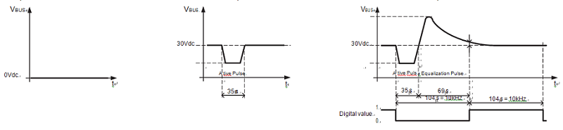 Figure 2 Scenario 1 the bus is not powered (left); The bus is powered but not by KNX Power supply (middle); The complete and working KNX Bus system that sending the correct digital “0” & ”1” command for communication (right)